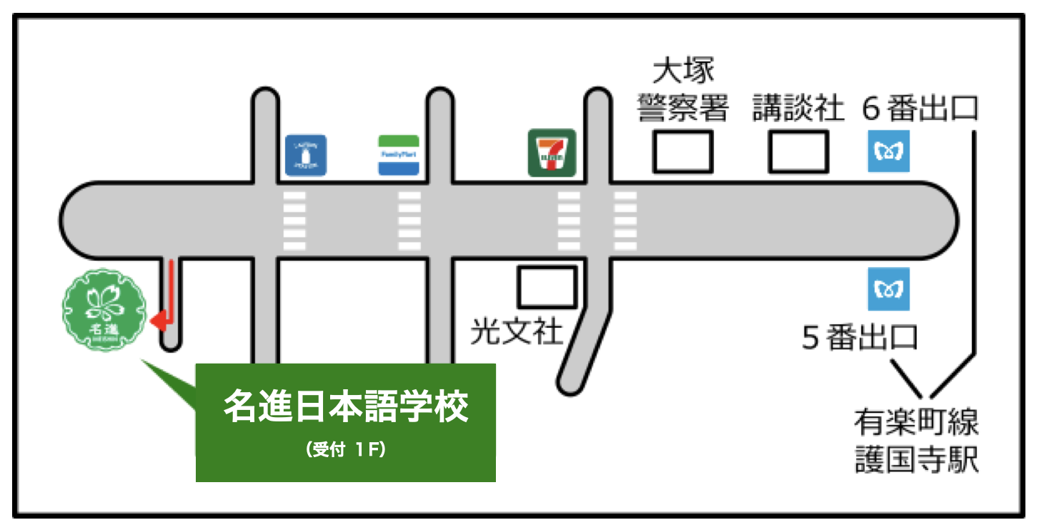 アクセス 2023.05.312026.01.30 名進日本語学校 住所:〒112-0013 東京都文京区音羽1丁目8番8号 最寄り駅:東京メトロ有楽町線「護国寺駅」より徒歩 10 分 TEL:03-3945-0901FAX:03-3945-0902